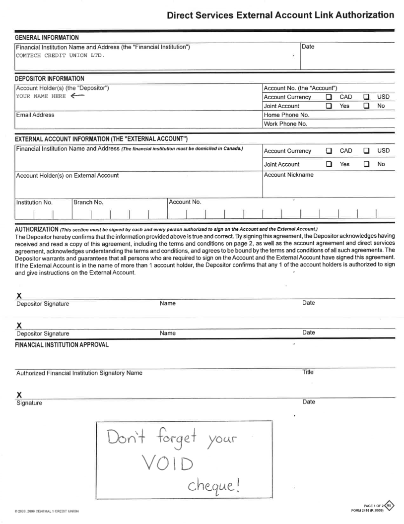 - Click on the Link External Accounts page and select Add an Account. Fill out the "Me-to-Me Transfer Authorization Form" and submit it along with your void cheque. See below for an example